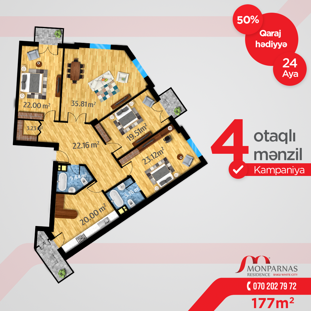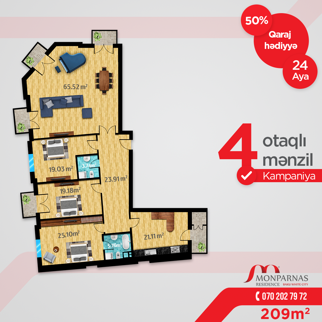 Monparnas Yaşayış kompleksindən 4 otaqlı (177 kvm və 209 kvm) mənzil alan hər kəsə